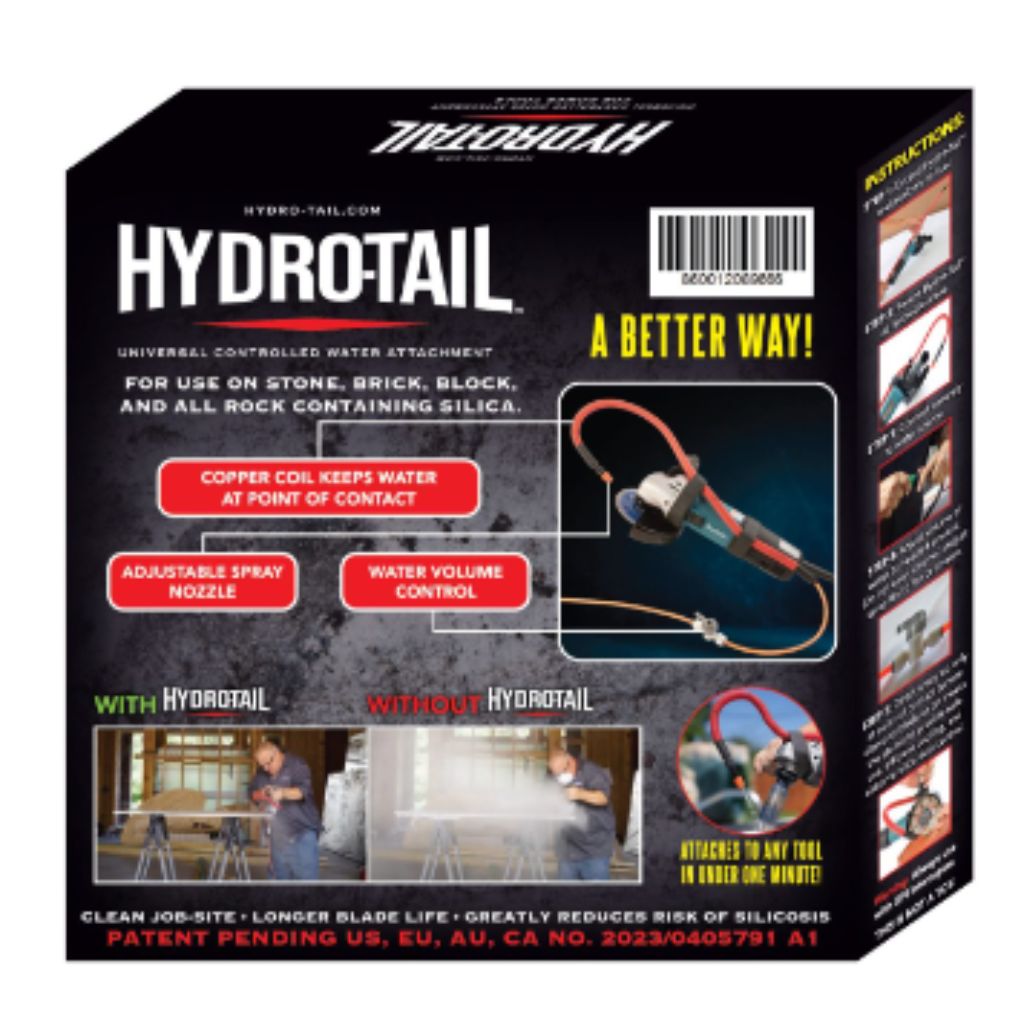 The Hydro-Tail™ universal controlled water attachment easily attaches to any power tool – not only to greatly reduce production of dangerous airborne/fine particle dust/silica for life saving benefits, but also dramatically increasing life and results of costly diamond blades and bits.